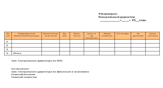 Ответственной службой за составление Плана по материально-техническому снабжению (МТС) является служба по материально-техническому снабжению (служба логистики). План по МТС представляет собой полный перечень в разрезе номенклатуры материальных ресурсов с указанием объемов поставки в натуральном и стоимостном выражении, а также с указанием поставщиков и сроков поставки. При составлении Плана по МТС на уровне предприятия определяются источники финансирования. При недостаточности собственных средств, предприятие рассматривает возможность привлечении заемных и кредитных средств. Правильное соотношение собственных и заемных источников образования оборотных средств играет важную роль в укреплении финансового состояния предприятия. Целесообразность привлечения того или иного источника определяется путем сравнения показателей рентабельности вложений данного вида и стоимости этого источника капитала. Основными задачами Плана по МТС являются: 1) своевременное и полное удовлетворение потребности предприятия в материально- технических ресурсах; 2) обеспечение высокого качества поставляемых ресурсов; 3) минимизация затрат на приобретение, доставку и хранение товарно-материальных ценностей; 4) определение оптимальных сроков поставки и размеров транспортных партий приобретаемых материальных ресурсов; 5) определение оптимального уровня запасов материально-технических ресурсов, основанного на нормах и нормативах. На небольших по масштабу предприятиях План по МТС может составляться не только по материальным ресурсам, входящим в состав оборотных средств, но и по основным средствам. На крупных предприятиях функция поставки основных средств зачастую выведена из службы материально-технического снабжения и передана в отделы, которые отвечают за инвестиционную деятельность (например, в отделы или управления по капитальному строительству). Рис. 7.5 - Примерный формат Плана по МТС (Плана по закупкам) предприятия