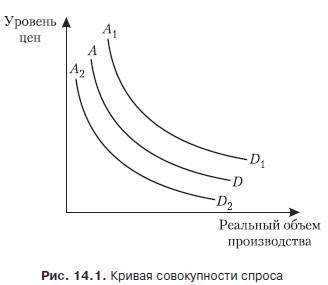 Значит, AD находится в прямой зависимости от денежной массы и скорости обращения денег и в обратной – от совокупной цены. Совокупный спрос, находясь в обратной зависимости от цены, снижается под влиянием ряда факторов. Повышение уровня процентной ставки, т. е. цены использования ссуды. Дело в том, что рост уровня цен заставляет и потребителей, и производителей брать деньги в долг. Это обстоятельство повышает процентную ставку. Поэтому покупатели откладывают свои покупки, а предприниматели сокращают инвестиции. В результате совокупный спрос уменьшается. Это явление называется «эффект процентной ставки». «Эффект кассовых остатков», или «эффект богатства». При повышении цен стоимость таких элементов богатства, как акции, облигации, срочные активы (кассовые остатки), падает и население, владеющее ими, беднеет. В результате совокупный спрос сокращается. «Эффект импортных товаров». При росте цен внутри страны спрос на отечественные товары сокращается, а на более дешевые импортные – растет. Все эти эффекты, связанные с изменением уровня цен, графически изображаются движением по кривой совокупного спроса (AD), приближая ее к оси абсцисс. Неценовые факторы смещают саму кривую А совокупного спроса либо вправо (A1D1), когда спрос увеличивается, либо влево (A2D2), когда он уменьшается (рис. 14.1).