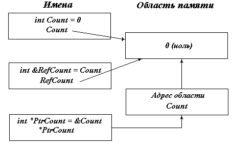Рис. 2.1. Переменная, ссылка и указатель на нее void FuncA (int &Parm) //ссылочный параметр { ++Parm; } void FuncB (int Farm) //нессылочный параметр { ++Parm; } void main() { int N = 0; FuncA (N); // N передается по ссылке // здесь N равно 1 FuncB (N); // передается через значение // здесь N все еще равно 1 } В этом примере функции FuncA и FuncB увеличивают значение параметра Parm. Однако только функция FuncA, которая получает параметр как ссылку, изменяет значение переменной N, передаваемой из вызывающей функции. Нельзя передать константу (например, 5) как параметр, если последний не объявлен как ссылка на тип const (см, раздел «Константы и функции»). void FuncA (int &RInt); void main () { FuncA (5); // СШИБКА: ссылка не может инициализироваться значением константы //... } Если в функцию передается переменная большого размера (например, большая структура), то использование ссылочного параметра сделает вызов функции более эффективным. При нессылочном параметре все содержимое переменной копируется в параметр. При ссылочном параметре он только инициализируется, ссылаясь непосредственно на оригинал переменной. Отдельная копия переменной при этом не создается. Чтобы использовать преимущества, предоставляемые ссылочным параметром, в языке C++, как и в языке С, можно использовать в качестве параметра указатель. (В частности, возможность изменения переменной, передаваемой вызывающей программой, и устранение операции копирования.) Однако ссылочными параметрами можно манипулировать с помощью более простого синтаксиса, подобного применяемому при работе с обычными переменными. Оператором &, можно объявить функцию, возвращающую ссылку. Например: int & Get Index(); Это объявление означает, что при вызове функции GetIndex будет создан временный псевдоним для некоторой целочисленной переменной (определяемой оператором return внутри функции). Следовательно, вызов функции GetIndex может находиться в любом месте выражения, содержащего данную целочисленную переменную, например: int N;