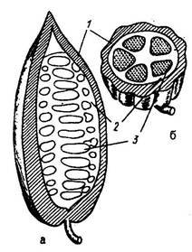 б) поперечный разрез какао плода. 1 -оболочка какао плода;
