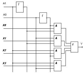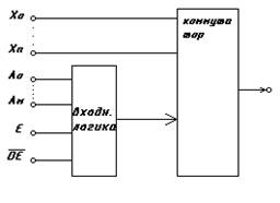 Ао-Ам - адресные сигналы. Е - управляющий сигнал, который выполняет строб ир ование выхода У. ОЕ - выключение и включение мультиплексора. Мультиплексор можно представить в виде коммутатора, который управляется входной логикой. Входные сигналы Хо - Хп поступают на входы коммутатора и только один из них подается на выход У. Чтобы определить, с какого входа информация поступит на выход, используются адресные сигналы Ао-Ам, поступающие на входную логику. Мультиплексоры могут иметь управляющий вход Е, который может выполнять стробирование выхода У. Кроме того, некоторые мультиплексоры имеют выходы с 3 состояниями: 0, 1, а также «отключено», т.е. выходн ое сопротивление = ∞. Перевод мультиплексора в третье состояние осуществляется сигналом ОЕ. Большинство мультиплексоров способны передавать информацию только в 1 направлении - от Х к У, однако имеются мультиплексоры, которые могут передавать информацию в обоих направлениях - это двунаправленные мультиплексоры. В зависимости от коммутационных возможностей для мультиплексоров используется следующая запись: n->1, где п - число входов. Например 4->1 это MUX, имеющий 4 входа и 1 выход. При этом необходимо учитывать число адресных входов - м. Если п=2м, то мультиплексор полный, а если п<2м, то мультиплексор неполный. Наибольшее распространение получили полные мультиплексоры, например 4 ->1, п=4, м=2; для мультиплексора 8->1, п=8, м=3; для мультиплексора 16->1, п=16, м=4. Построим мультиплексор 4->1. Он должен работать в соответствии с таблицей состояний: