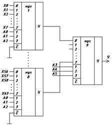 Микросхема КР531КП15 - мультиплексор 8->1, соответственно у него 8 входов. Чтобы увеличить это число входов до 64 необходимо использовать 9 мультиплексоров, один из которых будет основным, а на входы остальных 8-ми поступят все 64 сигнала. На адресные входы первых 8-ми мультиплексоров подаются младшие адресные сигналы А0-А2, которые выбирают один из 8 каналов в каждом MUX, а на адресные входы 9-го мультиплексора поступают старшие сигналы адреса А3-А5 – они определяют какой из 8-ми мультиплексоров 1-8 будет подключен к выходу У, а т.к. на вход каждого из 8 MUX подается по 8 сигналов, то получается 64->1. На вход Е только 9-го мультиплексора 64->1 подается напряжение, т.к у мультиплексора 64->1 только 1 выход, и его необходимо стробировать. Мультиплексоры применяются в качестве коммутаторов, преобразователей кодов, сумматоров, в сдвигающих устройствах, в схемах сравнения, в делителях частоты и т.д.
