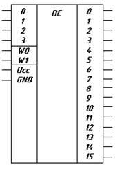 1. По числу выходов 2. По числу DMX в 1 корпусе ИМС. 3. По наличию стробирующего сигнала Е. 4. По способности передавать сигнал в двух направлениях. Так как DMX выполняет функции, схожие с дешифратором, то их УГО одинаково и они называются дешифраторы-демультиплексоры, например ИМС К555ИД3. Такой дешифратор (4->16) можно использовать в качестве DMX 1->16, при этом сигналы выбора DC (W0,W1) используются как основной вход DMX.