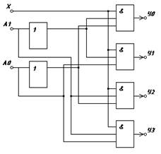 Используя эту таблицу, построим DMX на логических элементах 3И. В каждом логическом элементе 3И два входа используется для адресных сигналов А1 и А0, а на 3-й вход поступает входной сигнал Х, то есть этот сигнал Х появится на соответствующем выходе, если логический элемент 3И будет открыт с помощью адресных сигналов.