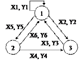 Имеем диаграмму из трех состояний. Дуги показывают изменение текущего состояния. Изменение состояния осуществляется под действием входного сигнала X, при этом система переходит в новое состояние и выдает выходной сигнал Y. Подобная диаграмма может быть использована в диалоговой вычислительной системе, где входные сигналы представляют собой команды, вводимые в систему с терминала пользователя, а выходные представляют собой имена подпрограмм. Таким образом, получив команду X и отыскав в списке по текущему состоянию соответствующий этой команде элемент описания исходящей дуги системы, выполняется подпрограмма, указанная в найденном элементе. Тем самым реализуется требуемая реакция Y. После этого система переходит в другое состояние, и с этого момента это состояние становится текущим.