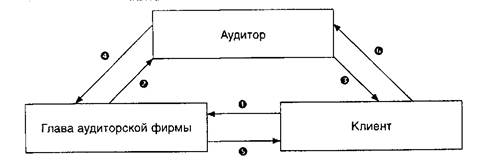 Рис. 6. Взаимоотношения между участниками аудиторского процесса Обозначения: 1 - клиент обращается к аудиторской фирме с просьбой провести проверку; 2 - глава аудиторской фирмы направляет аудитора к клиенту для предварительной оценки объема и содержания работ; 3- изучив документы клиента по выборочным данным, аудитор определяет для себя степень приемлемости клиента; 4 - аудитор докладывает главе аудиторской фирмы свои впечатления о клиенте, и, как правило, они вместе разрабатывают стратегию (отказаться от заключения договора или подготовить предварительные условия, на которых фирма могла бы провести требуемые клиентом работы, оформляя их письмом о проведении аудита); 5 - глава аудиторской фирмы и фирмы клиента обсуждают окончательные условия договора и, если достигают взаимопонимания, подписывают его; 6 - аудитор или (чаще) группа аудиторов приступают к проверке. Клиентов аудиторской фирмы можно разделить на два основных типа в зависимости от взаимоотношений «клиент — аудитор» в ходе аудиторской проверки: - формально-официальный — клиенты этого типа не собираются устанавливать с аудитором тесных контактов и требуют быстрейшего проведения аудиторской проверки; - неформальный — клиенты устанавливают с аудитором тесный контакт и надеются на его помощь. В этом случае внешний аудитор выполняет некоторые функции внутреннего аудитора и оказывает ряд сопутствующих услуг (консультации, анализ и т.п.).