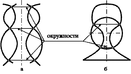 Использование сферы в качестве вспомогательной секущей поверхности основано на свойстве сферы пересекаться с соосной с ней поверхностью вращения по окружностям. Соосными называются поверхности вращения, имеющие общую ось. Две соосные поверхности вращения пересекаются друг с другом по окружностям, причем число окружностей равно числу точек пересечения меридианов таких поверхностей (рис.13.3,а). Если центр сферы находится на оси какой-нибудь поверхности вращения (рис.13.3,б), то сфера сосна с этой поверхностью и пересекается с ней по окружностям. Плоскости окружностей пересечения перпендикулярны общей оси вращения.