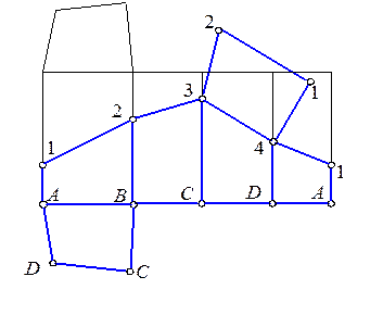 Полная развертка такой призмы (рис. 9.1) состоит из четырех прямоугольников, представляющих в истинном виде боковые грани призмы, и двух четырехугольников – ее верхнего и нижнего оснований. Взяв произвольную прямую (рис. 9.2), отложим на ней произвольно отрезки, равные сторонам основания призмы AB, BC, CD, DA, истинные длины которых имеем на рис. 9.1. Затем проведя в точках A, B, C и D к прямой перпендикуляры, отложим на них длину боковых ребер (высоту) призмы и соединим полученные точки прямой. Построенный прямоугольник представит развертку боковой поверхности призмы. Пристроив к одной из граней верхнее и нижнее основания призмы, получим полную развертку призмы. Пересечем ту же призму фронтально проецирующей плоскостью a (рис. 9.1) и нанесем на развертку линию, по которой плоскость a пересечет поверхность призмы. Для этого будет достаточно отметить на развертке точки 1, 2, 3 и 4, в которых боковые ребра призмы пересекаются плоскостью a, и каждые две смежные точки соединить прямой – это будут линии, по которым грани призмы пересекаются той же плоскостью.