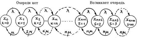 Рассмотрим теперь другой вид системы массового обслуживания, когда прибывшая заявка в случае, если все каналы к моменту ее прибытия заняты, не покидает станцию, а становится в очередь. Однако заявка может стать в очередь только при условии, что имеется место для ожидания. В противном случае заявка покидает очередь. Порядок вычисления числовых характеристик функционирования системы массового обслуживания для заданных условий следующий. Предположим, что система имеет в своем распоряжении n каналов и m - мест для ожидания в очереди. После того, как все места для ожидания в очереди заняты, прибывшая заявка получает отказ и немедленно покидает очередь (рис. 3). Из графа состояний системы (рис. 3) видно, что, включая состояние Хn очереди нет. Затем возникает очередь. Из графа состояний видно также» что поток, переводящий систему слева направо, определяется плотностью