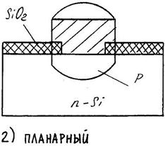 Рис 22 методы получения p-n переходов а) сплавной; б) мезаструктура; в) точечный; г) планарный электронно-дырочный переход можно получить, осуществляя диффузию примеси в исходную пластину полупроводника p- или n-типа. Уменьшение емкости p-n перехода осуществляется химическим путем: стравливается часть кристалла с одной стороны и получается мезаструктура. Малую емкость p-n перехода имеют также точечные диоды. Для изготовления такого перехода, электролитически заостренная металлическая игла приваривается к кристаллу полупроводника импульсом тока до 1А (метод формовки). Современным методом создания полупроводниковых приборов из кремния является планарная технология, основу которой составляет метод фотолитографии