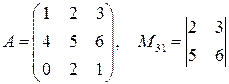 Миноры Выше было использовано понятие дополнительного минора матрицы. Дадим определение минора матрицы. Определение 2.5. Если в матрице А выделить несколько произвольных строк и столько же произвольных столбцов, то определитель, составленный из элементов, расположенных на пересечении этих строк и столбцов называется минором матрицы А. Если выделено s строк и столбцов, то полученный минор называется минором порядка s. Пример 2.3. Заметим, что вышесказанное применимо не только к квадратным матрицам, но и к прямоугольным. Если вычеркнуть из исходной квадратной матрицы А выделенные строки и столбцы, то определитель полученной матрицы будет являться дополнительным минором. Определение 2.6. Алгебраическим дополнением минора матрицы называется его дополнительный минор, умноженный на (-1) в степени, равной сумме номеров строк и номеров столбцов минора матрицы, т.е.