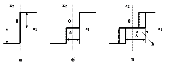 Рис. 2.3. Примеры релейных характеристик: а – обычные; б – с зоной нечувствительности D; в - с зоной нечувствительности D и гистерезисом h.