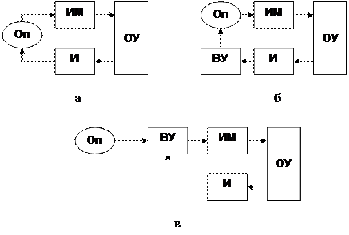 Рис. 5.7. Схемы режимов функционирования систем автоматизации: а – ручное управление; б – советчика оператора; в – автоматический