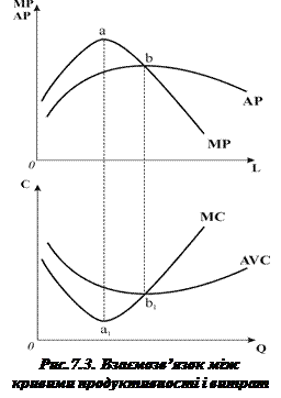 Обернений зв’язок між продуктивністю факторів виробництва і динамікою витрат ілюструє рис. 7.3, де зображені типові криві. Криві граничних витрат і середніх змінних витрат є дзеркальним відображенням кривих граничної і середньої продуктивності змінного фактора . Гранична продуктивність змінного фактора на низьких обсягах випуску зростає, на вищих – спадає, а прирости витрат, навпаки, на низьких обсягах мають спадний характер, а на вищих – збільшуються. Максимум граничної продуктивності змінного фактора відповідає мінімуму граничних витрат (точки а – а1), а максимум середньої продуктивності відповідає мінімуму середніх змінних витрат (точки b – b1). Аналогічну відповідність можна одержати, зобразивши криві та і .