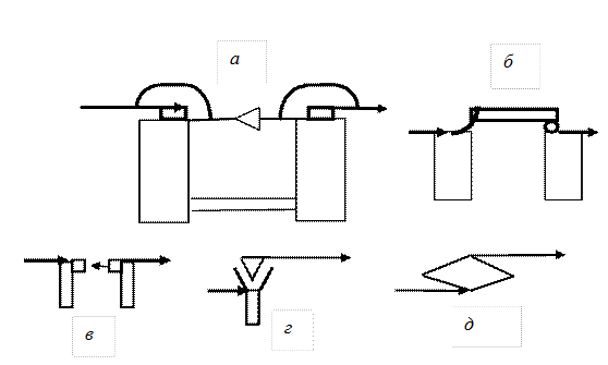 Во втором случае (рис. 48) без разрыва цепи (без отключения выключателя Q) производится переключение с одной системы шин на другую Для того, чтобы ошибочно не допускались отключения под нагрузкой, предусматриваются различные блокировки (механические и электромагнитные). Простейшие механические блокировки заложены в конструкции разъединителей. Приводы разъединителей (ручные, рычажные) обеспечивают фиксированное положение механически. При протекании через ножи (контакты) тока короткого замыкания возникают значительные электродинамические усилия, стремящиеся отбросить контакты. Чтобы предотвратить размыкание контактов, используют принцип “электромагнитного замка”. Для этого один из ножей выполняют двухполосным. Второй нож врубается между полосами. Так как в полосах ток имеет одинаковое направление, они притягиваются и зажимают нож второго контакта. Разъединители позволяют включать и отключать: · нейтрали трансформаторов; · намагничивающий ток трансформаторов ограниченной мощности; · зарядный ток линий ограниченной длины; · нагрузочный ток до 15А при напряжении 10кВ. По конструкции различают разъединители (рис. 49): а) поворотные (горизонтально-поворотные); б) рубящие (вертикально-поворотные); в) катящиеся (в ячейках КРУ); г) подвесные; д) пантографические (со складывающимися ножами).