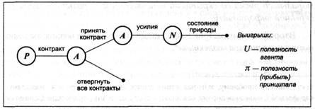 Моральный риск со скрытыми действиями Классический способ моделирования подобных ситуаций основан на предположении, что уровень усилий агента, осуществляемых после заключения контракта, не наблюдаем. Но тогда эту переменную нельзя прописать в контракте. И, следовательно, оплата агента за выполняемую согласно контракту работу не может зависеть от уровня прикладываемых им усилий, а точнее, усилий, оговоренных в контракте. Моральный риск со скрытыми действиями возникает в игре, последовательность событий в которой такова (см. рис. 2.1): 1. Принципал составляет набор контрактов и предлагает его агенту. 2. Агент решает, принять ли ему какой-либо из этих контрактов, или отвергнуть их все. 3. Если агент выбрал контракт, он совершает предписанные этим контрактом действия, интенсивность которых не наблюдаема принципалом. 4. Пассивный игрок определяет состояние природы. 5. На основании хода агента и реализовавшегося состояния природы определяется результат работы агента. 6. По результату работы агента определяются выигрыши (вознаграждение агента и прибыль принципала).