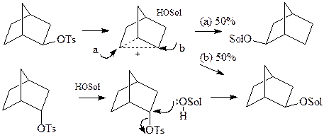 Сольволіз екзо -норборнілтозилату відбувається набагато швидше, ніж ендо -ізомеру. Утворюється рацемічний продукт, причому з міграцією тозилатної групи на 6-атом, що доводить утворення некласичного карбокатіона. ендо -Ізомер дає виключно продукт обернення конфігурації.