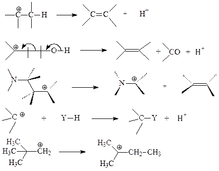 Йони карбенію стабілізуються за рахунок елімінування протона, приєднання нуклеофілу, перегрупування або фрагментації з утворенням олефінів.