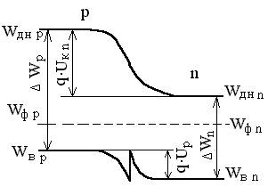 Рис. 1.16 Упрощенная энергетическая диаграмма p-n гетероперехода в равновесном состоянии. На рис. 1.16 приведена упрощенная энергетическая диаграмма n-p перехода между арсенидом галлия р -типа (ΔWP = 1,5 эВ) и германием n -типа (ΔWn = 0,67 эВ) в состоянии равновесия (U = 0). При контакте полупроводников происходит перераспределение носителей зарядов, приводящее к выравниванию уровней Ферми p - и n -областей и возникновению энергетического барьера для электронов n -области q×Ukn и. для дырок p -области q×Uкp, причем Uкn > Uкp.