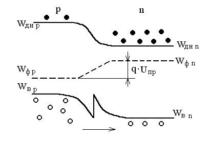 Рис. 1.17 Упрощенная энергетическая диаграмма p-n гетероперехода, включенного в прямом состоянии. В состоянии равновесия ток через n-p переход равен нулю. Поскольку потенциальные барьеры для дырок и электронов различны, при приложении к гетеропереходу прямого напряжения смещения он обеспечит эффективную инжекцию дырок из полупроводника с большей шириной запрещенной зоны (рис. 1.17).