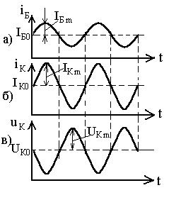 Рис. 3.13 Схема усилителя на БТ. Работа такого усилителя поясняется временными диаграммами токов и напряжений, изображенными на рис. 3.. При IБm =0 токи базы и коллектора будут определяться токами в рабочей точке (IБ0, IК0)и напряжением на коллекторе UК0= ЕК-IК0 × Rк
