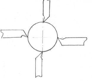 2. Шліфування різьби багатониточним кругом з кільцевими нитками на заготовках з малою довжиною частини, що нарізається (<40мм) менше ширини круга, способом врізання – круг отримує поперечну подачу на висоту витка при повільному обертанні заготовки, після чого остання робить один повний оберт (переміщається вздовж своєї вісі на один крок). Цього достатньо, щоб прошліфувати всю різьбу по заготовці. Цей спосіб відрізняється дуже високою продуктивністю і дозволяє шліфувати різьби "із цілого", тобто без попереднього прорізання, але точність різьби нижча, чим при роботі однониточним кругом і становить +6 на половину кута профілю. Профілювання багатонитчатого шліфувального круга здійснюється шляхом накатування кільцевих канавок сталевим роликом. Ролик для накатування виготовляють із