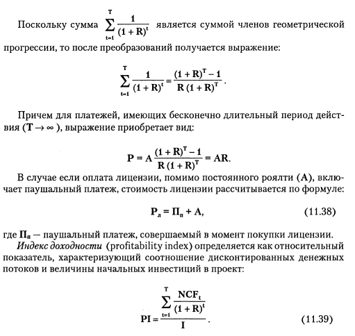 где I — единовременные инвестиционные издержки, совершаемые на инвестиционном (нулевом) интервале. Положительное значение NPV свидетельствует о целесообразности принятия решения о финансировании и реализации проекта, а при сравнении альтернативных вариантов вложений экономически выгодным считается вариант с наибольшей величиной чистого дисконтированного потока. Метод текущей стоимости может использоваться также для оценки стоимости некоторых видов лицензий и ценных бумаг, для которых характерны аннуитетные платежи (от англ. annuity — ежегодная рента), т. е. постоянные по величине и регулярно совершаемые денежные платежи. В этом случае показатель NPV определяет текущую оценку стоимости лицензии:
