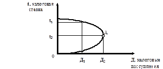 Каковы границы налогообложения, каков тот допустимый уровень налоговых ставок, который не сказался бы отрицательно на экономике? Американский экономист А. Лаффер установил и показал с помощью графика зависимость доходов бюджета от налоговых ставок на прибыль и зарплату. Кривая Лаффера демонстрирует, что существует оптимальный уровень налоговой ставки, при котором налоговые поступления в бюджет максимизируются. В случаях, когда этот уровень выше оптимального, эффективность налогообложения падает. Лаффер писал: ²Люди основывают свои поступки на стимулах. Когда вы изменяете эти стимулы, они изменяют своё поведение. Люди не работают для того, чтобы платить налоги. Чистый, за вычетом налогов, доход определяет, работает ли человек или сидит на пляже... Фундаментальная идея, лежащая в основе кривой..., заключается в том, что чем выше предельные налоговые ставки, тем более сильный побудительный мотив будет у индивидуумов от уклонения от них². Рис. 13-3 иллюстрирует кривую Лаффера, где t - средний уровень налоговых ставок, Д - среднегодовой (долгосрочный) показатель объема налоговых поступлений. Точка А показывает налоговый оптимум, при котором налоговые поступления государству достигают максимума (Д2). Предположим, что налоговые ставки снижены с уровня t1 до t2. Хотя ближайшим результатом более либеральной налоговой политики станет временное падение объема налоговых поступлений, но в долгосрочном периоде улучшатся условия инвестирования, вырастет производство, занятость, а вслед за этим - масса доходов, подлежащих нало гообложению. Начнут расти и доходы государства (Д2 > Д1).