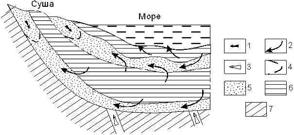Рис. 10. Седиментационный этап гидрогеологического цикла. 1-инфильтрационное питание за счет просачивания метеорных вод; 2-элизионное питание в результате выжимания из уплотняющихся глин седиментогенных вод; 3-эндогеннное питание ювенильными флюидами и метаморфогенными водами; 4- фронт внедрения инфильтрационных вод; 5- водоносные песчаные отложения; 6- глинистые водоупоры; 7- кристаллический фундамент.