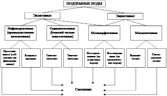 Понятие о ресурсах подземных вод прямо связано с их происхождением. На основе современных теоретических представлений можно выделить следующие пути образования подземных вод (генетические типы): 1. Инфильтрационные воды – образовались путем инфильтрации. Сюда же можно отнести и инфлюационные воды (втекающие потоками по трещинным и карстовым пустотам). Эта теория всегда была господствующей, т.к. отвечала запросам практики водоснабжения и подтверждалась визуальными наблюдениями. 2. Конденсационные воды – проникающие главным образом из атмосферы в виде пара и конденсирующиеся в породах. Явление конденсации имеет место и при миграции различных газов (в том числе углеводородных) из мест с высокими в места с низкими температурой и давлением. 3. Седиментационные воды – захоронявшиеся вместе с осадочным материалом в процессе литогенеза и претерпевшие значительные изменения в ходе геологической истории. Эти три генетических типа подземных вод входят в понятие экзогенные воды (рис. 12). 4. Эндогенные воды – образуются в горных породах при их метаморфизме, в магматических очагах, а также при дегидратации минералов и в некоторых других процессах (рис.12). А.А. Карцев выделяет также “возрожденные воды” – продукт дегидратации глинистых минералов и метаморфизма пород. Они занимают промежуточное место между седиментационными и эндогенными водами.