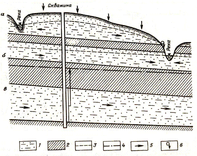 1-водоносные горизонты, (а-верховодка, б- грунтовые воды, в-артезианские воды), 2-водоупорные породы, 3- уровень ненапорных вод, 4- пьезометрический уровень напорных вод, 5- направление движения подземных вод, 6- родник грунтовых вод