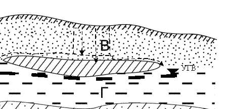 Условные обозначения: В - зона аэрации (верховодка), Г - зона насыщения (грунтовые воды) УГВ - уровень грунтовых вод.