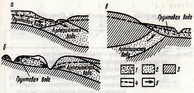 а — питание артезианских вод грунтовыми; б — переход артезианских вод в грунтовые; в — питание грунтовых вод артезианскими. 1 — водоносные рыхлые четвертичные отложения; 2 — водоносные горизонты в коренных породах; 3 — водоупорные породы; 4 — уровень воды; 5 — направление движения воды
