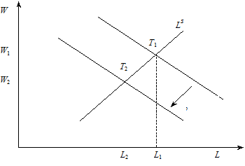 Згідно з наведеним графіком початкова рівновага на ринку праці забезпечується в точці Т 1, в якій крива попиту ( Тепер припустимо, що внаслідок несприятливого збурення на товарному ринку попит на робочу силу впав до L 2 і тому його крива змістилася в положення ( Отже, якщо першопричиною циклічного безробіття є несприятливі збурення на товарному ринку, то ще однією причиною його є негнучка заробітна плата. У зв’язку з цим розгляд причин негнучкості заробітної плати дає змогу повною мірою уявити причини циклічного безробіття. До основних причин негнучкості заробітної плати можна віднести: закони про мінімальну заробітну плату, вплив профспілок на заробітну плату, ефективну заробітну плату. Закони про мінімальну заробітну плату. У багатьох країнах функціонують закони про мінімальну заробітну плату, що регламентують мінімально допустиму межу оплати праці, якої зобов’язані дотримуватися всі роботодавці. Для більшості найманих працівників установлений мінімум нічого не важить, оскільки їхня заробітна плата перевищує його. Проте для некваліфікованих і недосвідчених працівників встановлена мінімальна заробітна плата може перевищувати її рівноважний рівень. Унаслідок цього попит на таку робочу силу формується на рівні, нижчому, за її пропозицію, що спричинює безробіття. Дослідження американських науковців показали, що в разі збільшення мінімальної заробітної плати підлітків на 10 % їх зайнятість зменшується від 1 до 3 %. Вплив профспілок на заробітну плату. У розвинених країнах відчутну роль у формуванні заробітної плати відіграють профспілки. Основним інструментом їх впливу на заробітну плату є трудові угоди, які лідери профспілок укладають із роботодавцями на тривалий період (від одного до трьох років). Ці угоди передбачають підтримання певного рівня номінальної заробітної плати протягом усього терміну дії угоди або використання формули, згідно з якою в межах цього періоду номінальна зарплата піддається індексації з урахуванням інфляції. Укладаючи угоди, профспілки намагаються захистити своїх членів від збурень в економіці, які зумовлюють зниження заробітної плати. Іншими словами, заробітна плата членів профспілкових організацій визначається не рівновагою на ринку праці, а трудовими угодами. За цих умов рівень погодженої заробітної плати, як правило перевищує рівноважний, що спричинює безробіття. Ступінь впливу профспілок на заробітну плату і безробіття визначається трьома обставинами. По-перше, це по рівень розвитку профспілкового руху, що є різним у різних країнах. Він залежить від частки найманих працівників, які об’єднуються в профспілкові організації. Так, у США лише 16 % найманих працівників входять до складу профспілок. У більшості європейських країн, особливо скандинавських, профспілки у суспільному житті відіграють набагато вагомішу роль. Чим більша частка найманих працівників охоплена профспілковим рухом, тим сильнішим є вплив профспілок на процес прийняття рішень щодо заробітної плати. По-друге, це поділ економічно активного населення на дві групи — зайняті (інсайдери) та безробітні (аутсайдери) з протилежними інтересами. Одні намагаються підтримувати високий рівень заробітної плати, інші — зацікавлені в її зниженні з метою створення передумов для збільшення попиту на робочу силу. Тому резуль