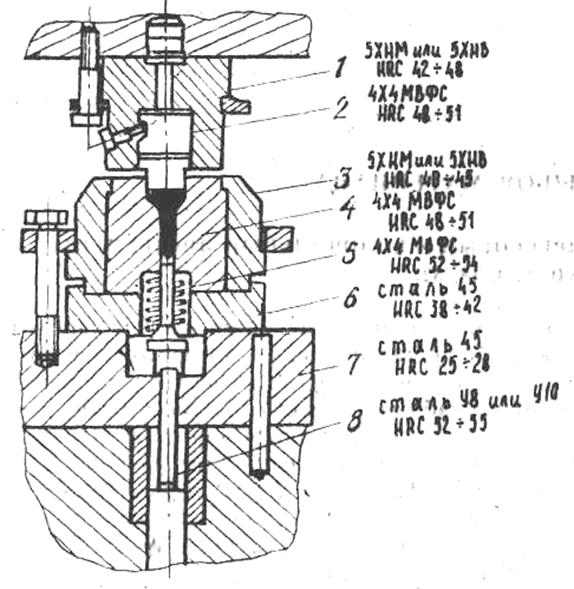 Работоспособность инструмента во многом определяется правильностью выбора материала, из которого он изготовлен. Выбор материала, в свою очередь, зависит от назначения инструмента, условий работы, а также экономических соображений. На рисунке 57 указаны марки стали и нормы твердости для основных деталей штампа выдавливания пазовой фрезы на высокоскоростном молоте. Наиболее нагруженные детали: пуансон 2, матрица 4 и выталкиватель 5 изготавливаются из высоколегированной инструментальной стали 4Х4МВФС с твердостью 48—51 HRC. Крепежные детали 1, 3, 6, 7, 8 — из конструкционных сталей.
