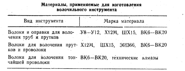 Таблица 6 – Материалы, применяемые для изготовления волочильного инструмента