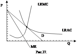 Монополистическая конкуренция - такой тип рыночной структуры, при котором множество фирм производят дифференцированные товары. Продукция этих фирм является близкой, но не полностью взаимозаменяемой, т.е. каждая из множества мелких фирм производит продукт, несколько отличающийся от продукции ее конкурентов. Основные черты монополистической конкуренции следующие: ü как и в условиях чистой монополии, монополистически конкурентная фирма сталкивается с убывающей кривой спроса, т.е. является «искателем» цены; ü как и в условиях совершенной конкуренции, доступ других фирм на рынок свободен, а потенциальная возможность получить прибыль привлекает новые фирмы с конкурирующими марками товаров, снижая экономические прибыли до нуля; ü отсутствует взаимная зависимость фирм, тайный сговор практически невозможен; ü экономическое соперничество влечет за собой как ценовую, так и неценовую конкуренцию. Теория монополистической конкуренции выделяет краткосрочный и долгосрочный периоды. Спрос в условиях монополистической конкуренции является эластичным по цене, но лишь до определенных пределов. Он более эластичен, чем в условиях простой монополии. Выбор оптимального объема производства, максимизирующего прибыль, аналогичен выбору монополиста (рис.27).
