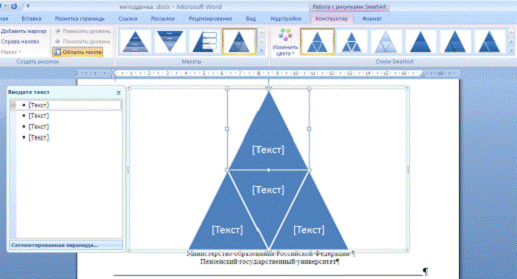 После добавления объекта SmartArt в документ, можно ввести текст в поля, отмеченные как [Текст]. Это можно делать как непосредственно в области объекта, так и используя специальную область задач «Введите текст».