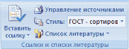 Для добавления нового источника нужно нажать кнопку «Вставить ссылку» и выбрать команду «Добавить новый источник». В окне создания источника выбирается тип источника. Это может быть книга, раздел книги, журнальная статья, статья в периодическом издании, веб-узел, дело, материалы конференции, интервью, фильм, спектакль, аудиозапись и т.д. Тут же заполняются поля списка литературы: название, автор, год и город выпуска, издательство. Обратите внимание, что эти поля могут изменяться, в зависимости от типа источника. Также имеет значение, какой стиль списка литературы выбран. По-умолчанию используется ГОСТ, однако вы также может выбрать ISO 690, Turabian, MLA, APA, Chicago, GB7714, SIST02 и другие.