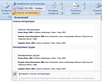 Для автоматического добавления в документ списка литературы нажмите кнопку «Список литературы» и выберите один из вариантов оформления ссылок: как списка литература или как цитируемых трудов. Для изменения оформления этого списка и полей, которые будут в него вынесены, можно использовать меню «Стиль».
