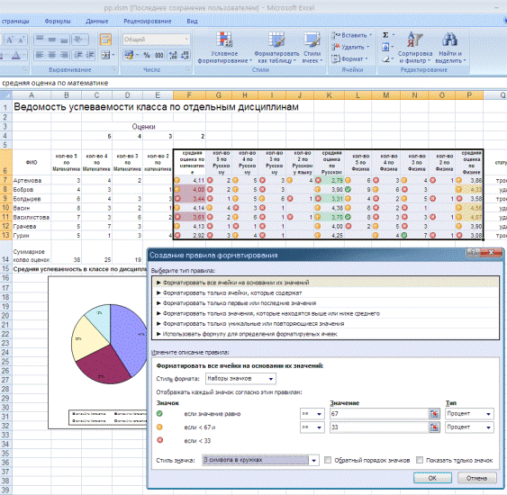 В Excel 2007 для визуального выделения данных в целях анализа можно использовать условное форматирование. Богатый набор схем визуализации позволяет обнаруживать и показывать важные тенденции, а также отмечать исключения в данных с помощью цветных градиентов (изометрические карты), столбцов данных и значков. В Excel 2007 нет больше ограничения в три критерия (цвета) в условном форматировании. Теперь для любых ячеек и диапазонов возможно задавать любое количество условий. Отображается все это диалоговом окне «Создание правила форматирования». Можно создавать и управлять различными правилами условного форматирования.