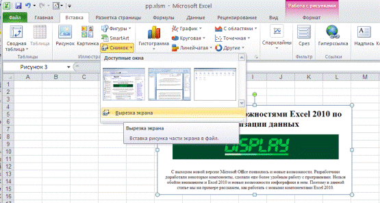Excel 2010 позволяет передавать информацию не только в виде сухих цифр или сложных диаграмм. Но и в виде фотографий, картинок и рисунков SmartArt. Снимки экрана. Можно быстро сделать снимок экрана и добавить его в книгу, а затем отредактировать и улучшить его с помощью средств на вкладке «Работа с рисунками».