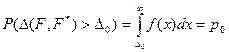 Обрабатывая независимые измерения случайной величины ξ, мы можем построить статистическую функцию распределения F*(x). По виду этой функции можно принять гипотезу, что истинная теоретическая функция распределения есть F(x). Сами независимые измерения (x1, x2,…,xn), образующие выборку, можно рассматривать как одинаково распределенные случайные величины с гипотетической функцией распределения F(x). Очевидно, между функциями F*(x) и F(x) будут некоторые расхождения. Возникает вопрос – являются ли эти расхождения следствием ограниченности объема выборки или связаны с тем, что наша гипотеза не верна, т.е. действительная функция распределения не F(x), а какая-то другая. Для решения этого вопроса пользуются критериями согласия, суть которых в следующем. Выбирается некоторая величина Δ(F, F*), которая характеризует степень расхождения между функциями F*(x) и F(x). Например, Δ(F, F*)=Sup|F(x)-F*(x)|, т.е. верхняя грань по х модуля разности. Считая гипотезу верной, т.е. зная функцию распределения F(x), можно найти закон распределения случайной величины Δ(F, F*) (вопроса, как это сделать, мы касаться не будем). Зададим число р0 столь малое, что осуществление события {Δ(F, F*)>Δ0}с этой вероятностью будем считать практически невозможным. Из условия найдем величину Δ0. Здесь f(x) – плотность распределения Δ(F,F*).