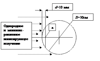 Рис.1. На шар, изготовленный из тканеэквивалентного вещества плотностью 1 г/ см3 и диаметром 30 см, центр которого совмещается с точкой измерения, падает однородное и мононаправленное ионизирующее излучение. Амбиентная доза в центре шара равна значению эквивалента дозы (в точке «а») на глубине d от поверхности шара по его диаметру. В зависимости от глубины, на которой проводятся измерения амбиентная доза, она обозначается – H *(10) или H *(0,7). Амбиентная доза в заданной точке поля излучения определяется как эквивалент дозы, который был создан широким и направленным полем излучения в сфере МКРЕ на глубине d от поверхности сферы по её диаметру, ориентированному параллельно оси направленного поля. Широким называется поле, в котором характеристики не меняются в интересующей нас области пространства.