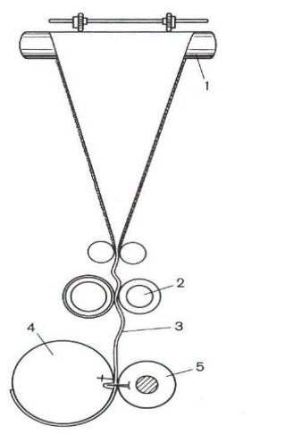 Рисунок 8.3. Неплотный контакт натяжных валиков: 1- бумаговедущий валик фальцворонки; 2- натяжные ролики; 3 – участок слабого натяжения полотна; 4 – цилиндр с графейками; 5 – цилиндр с фальцножом. Контрольные вопросы: 1. Какие основные устройства фальцаппарата? 2. Какой механизм регулируют скорость и натяжение бумажного полотна в фальцаппарате? 3. С помощью какого устройства, обеспечивают более равномерное давление по сравнению с роликами, давление которых создается за счет натяжения пружины? Натяжение полотна должно быть достаточно большим, чтобы можно было устранить отклонения в приводке линии рубки. 4. Какая регулировка обеспечивает беспрепятственное прохождение склейки при смене рулонов? 5. Из-за чего бумажное полотно бумаговедущим валиком фальцворонки подается на цилиндр с графейками с вибрацией?