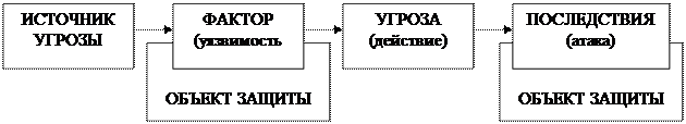 Рис. 3.1. Механизм формирования атаки Возникает следующая цепочка: источник угроза — фактор (уязвимость) — угроза (действие) — следствие (атака). Источник угрозы — это потенциальные антропогенные, техногенные или стихийные носители угрозы безопасности. Угроза (действие) — это возможная опасность (потенциальная или реальная) совершения любого действия (действия или бездействия), направленного против объекта защиты (информационных ресурсов), которое наносит убыток собственнику или пользователю, которая проявляется как опасность искажения или потери информации. Фактор (уязвимость) — это свойственные объекту информатизации причины, которые приводят к нарушению безопасности информации на конкретном объекте и предопределенны слабыми местами процесса функционирования объекта информатизации, свойствами архитектуры информационно-телекоммуникационной системы, протоколами обмена и интерфейсами, которые применяются, программным обеспечением и аппаратными средствами, условиями эксплуатации. Следствие (атака) — это возможные последствия реализации угрозы (возможные действия) при взаимодействии источника угрозы через имеющиеся факторы (уязвимости). Атака — это всегда пара "источник-фактор", который реализует угрозу и приводит к убыткам.