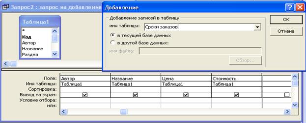 5. В диалоговом окне добавить имя таблицы, например, Сроки заказов и щелкнуть на кнопке ОК. 6. В графе Добавление добавить Срок заказа