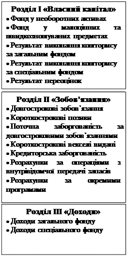 Рис. 1.7 Структура балансу бюджетної установи Актив і пасив балансу складається з окремих статей, кожна з яких відображає розмір певного економічного однорідного виду майна або його джерел. Статті бухгалтерського балансу, своєю чергою, об’єднуються в економічні однорідні групи майна та джерел його утворення – розділи. Склад статей активубалансу характеризує належність бюджетних установ до галузей невиробничої сфери (необоротні активи, оборотні активи, витрати). Склад статей пасиву балансу вказує,що бюджетні установи – це установи державної чи комунальної форми власності, які утримуються за рахунок державного або місцевих бюджетів (власний капітал, зобов’язання, доходи). За складом статей і побудовою баланс бюджетних установи відрізняється від балансів суб’єктів підприємницької діяльності і має на меті не розкриття інформації для зовнішніх користувачів, а забезпечення контролю та аналізу використання бюджетних коштів. Активи й витрати бюджетних установ не оцінюються щодо їхньої здатності трансформуватися у грошові кошти, а тому й розділи активу балансу не розміщуються за ознаками зростаючої ліквідності, як це прийнято в балансі суб’єктів підприємницької діяльності. Загальні підсумки активу і пасиву балансу повинні бути рівні між собою, тобто сума активів бюджетних установ повинна дорівнювати сумі капіталу та його зобов’язань. Це обов’язкова умова правильності складання бухгалтерського балансу. Рівність підсумків активу і пасиву балансу зумовлена тим, що в обох його частинах відображено у вартісному вимірнику одне і те саме майно бюджетних установ, тільки згруповане за різними ознаками: в активі – за складом і розміщенням, в пасиві – за джерелами утворення і цільовим призначенням. Підсумок не може бути більшим або меншим за підсумок пасиву, оскільки загальна вартість майна бюджетних установ завжди повинна дорівнювати сумі тих джерел, за рахунок яких воно утворене. Відсутність рівності підсумків активу і пасиву балансу свідчить про наявність помилок, допущених в облікових записах або під час складання самого балансу.