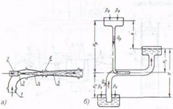 Рис. 4. 3. Водоструменевий насос: а — схема насосу; б —схема установки насосу: 1 —всмоктувальна труба; 2 — напірна труба; 3 — сопло; 4 — змішувальна камера; 5 — дифузор; 6 — горловина