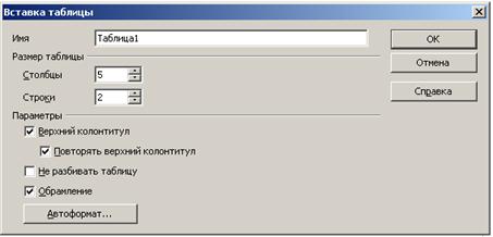 3.2.3 Створення таблиць та діаграм Таблицю можна створити за допомогою команди Вставка → Таблица (або кнопки Вставить головної панелі інструментів). З’являється вікно Вставка таблицы, за допомогою якого можна задати розмір таблиці (кількість рядків і стовпчиків), назву таблиці, обрамлення. Після того, як таблиця буде відображена у документі, на екрані з’являється панель форматування таблиці, кнопки якої дозволяють вставляти/видаляти рядки і стовпчики, об’єднувати комірки, змінювати стиль обрамлення, встановлювати колір фону.
